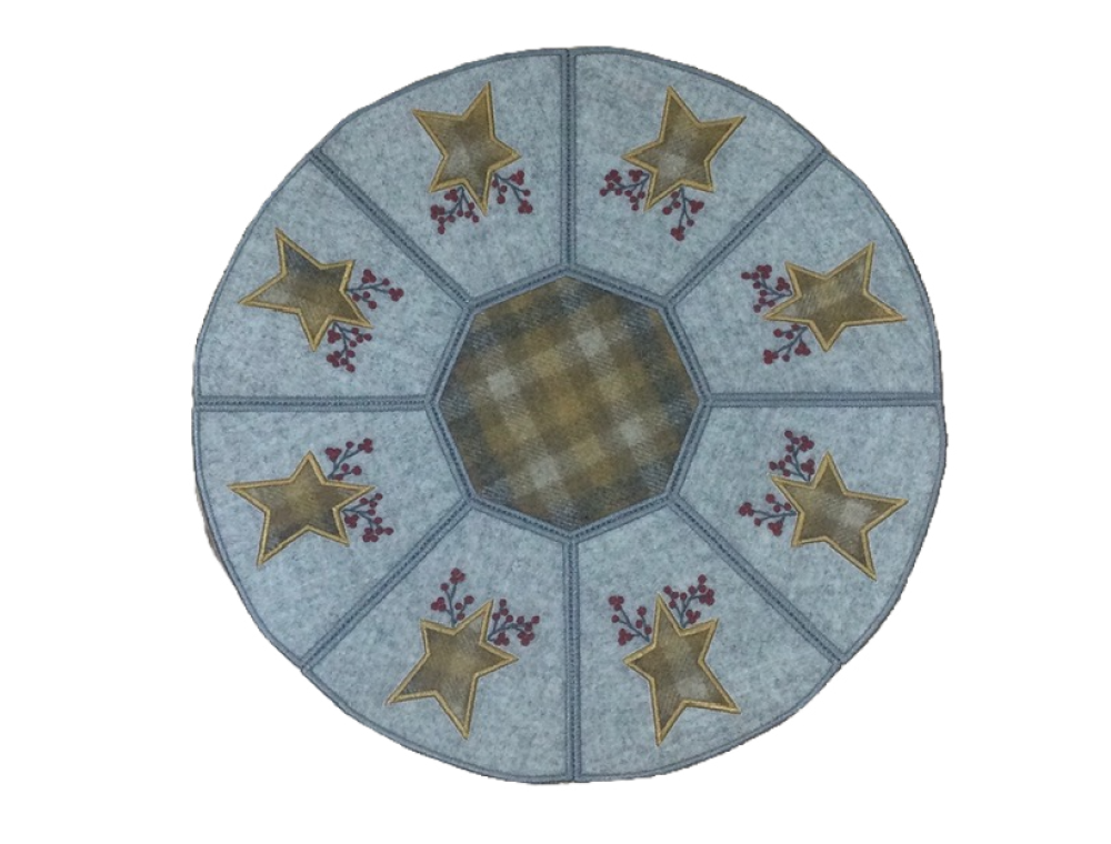 Segments Embroidered in the hoop, stitched together on a sewing machine.